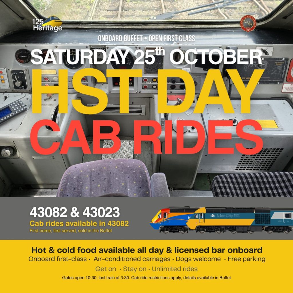 Cab rides! We are offering cab rides on the 25th of October. Along with the usual unlimited train rides, onboard buffet serving hot and cold foods we will offer you the chance to ride in the cab of 43 082. Interested? Head to the buffet and ask, certain restrictions and limitations apply.